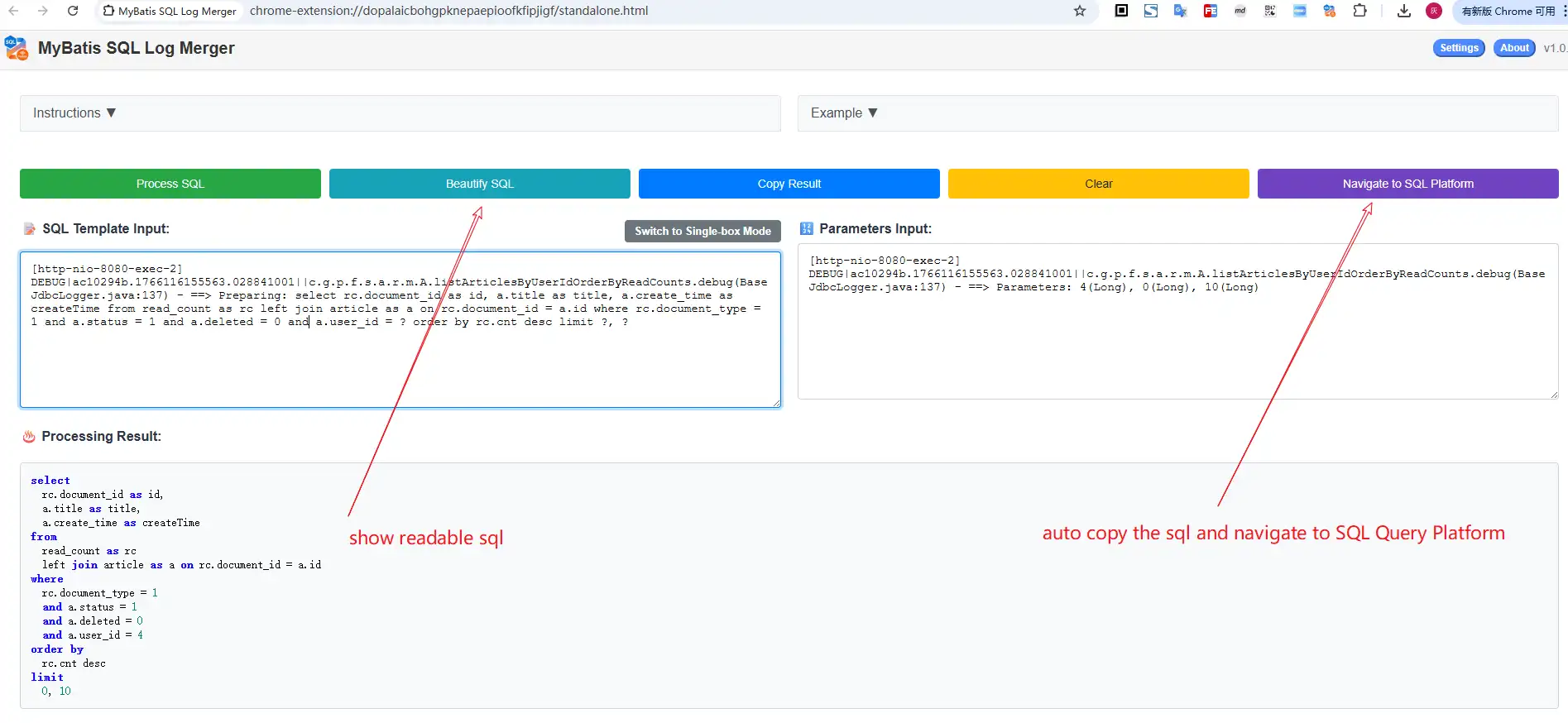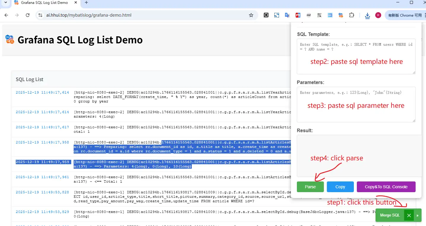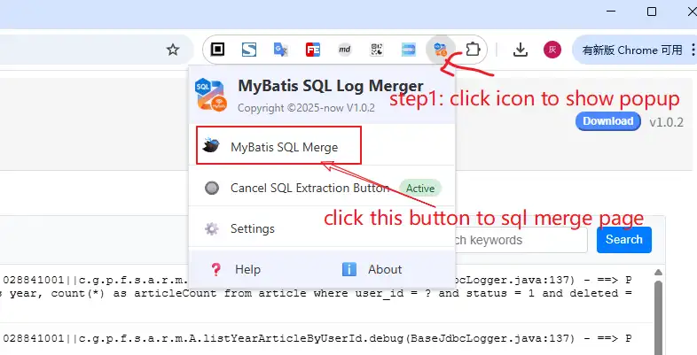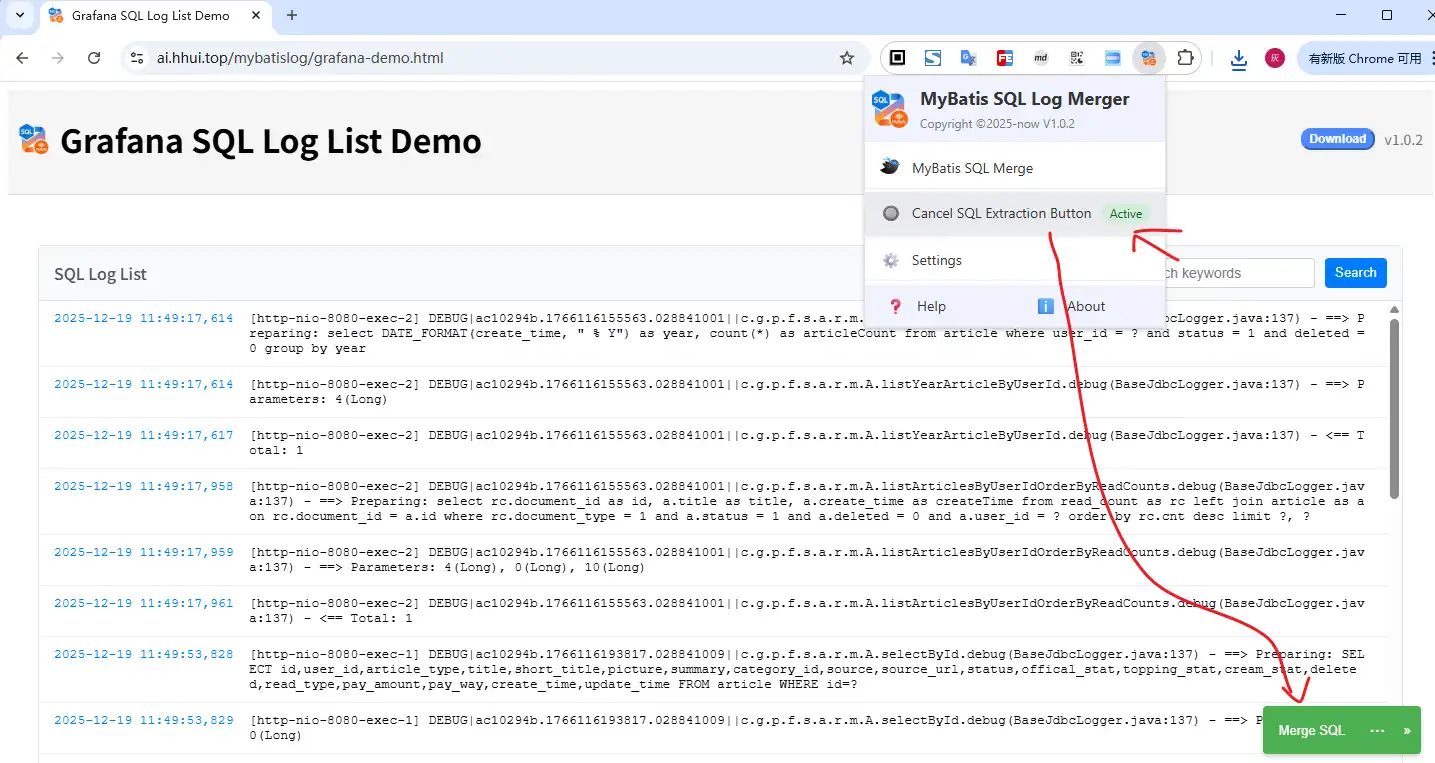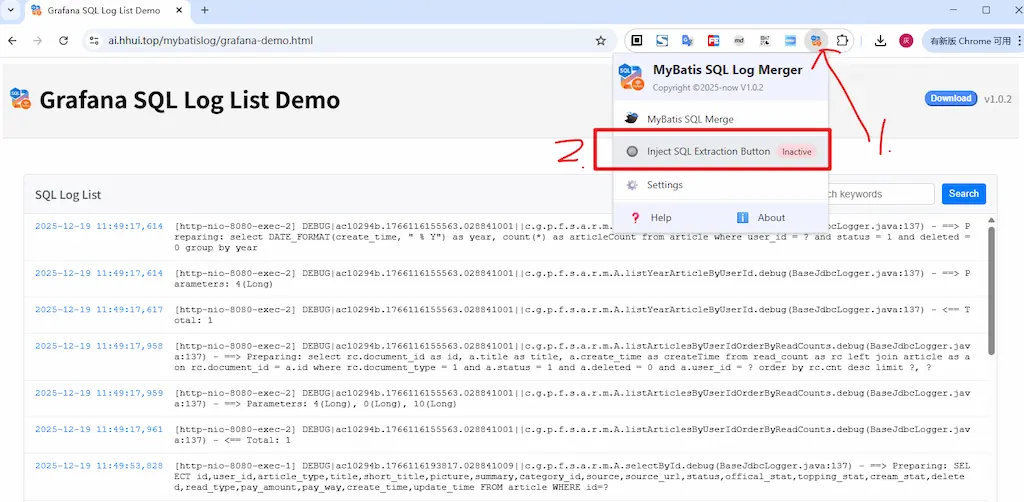 MyBatis SQL Log Merger offers a convenient way to extract SQL directly from any webpage by injecting a button into the page. Here's how to activate this feature: