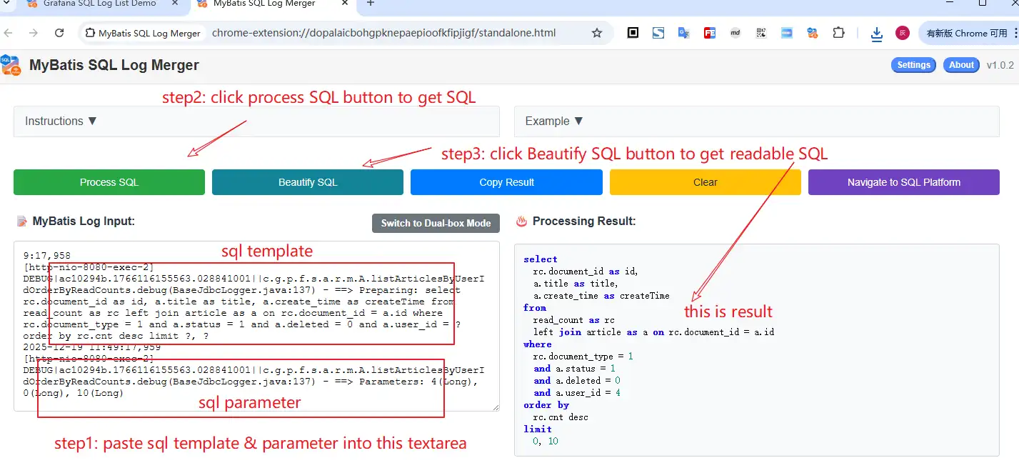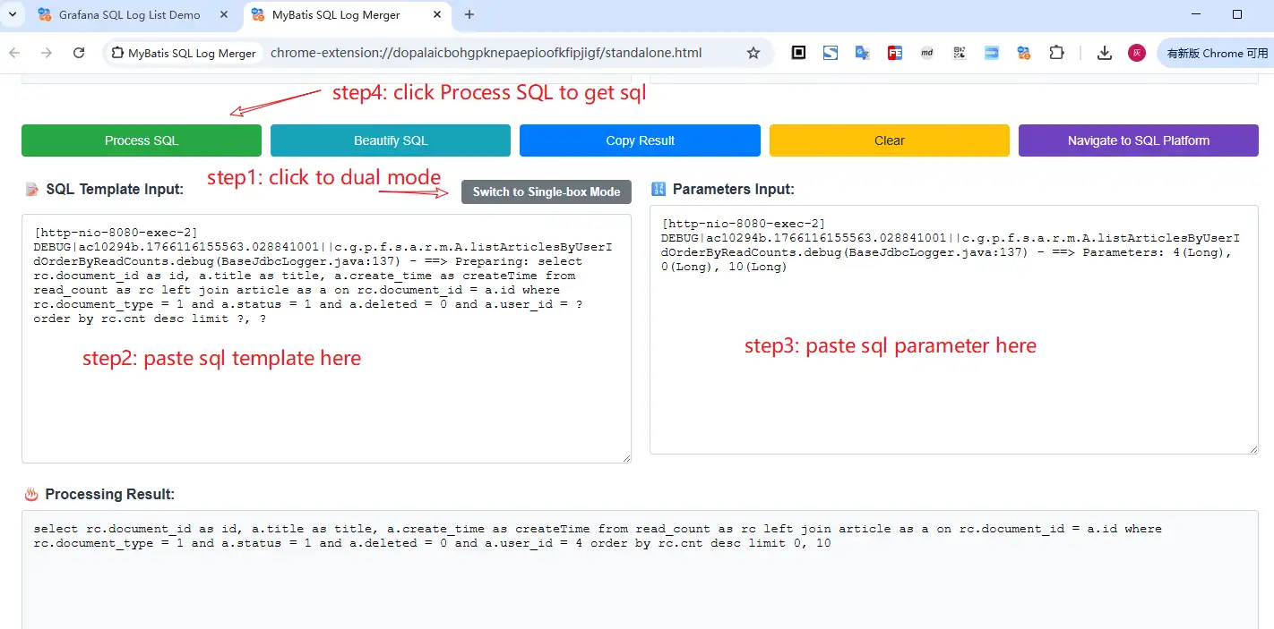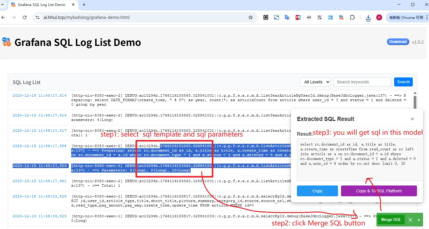 Once activated, you can easily extract SQL from any selected MyBatis logs on the page: