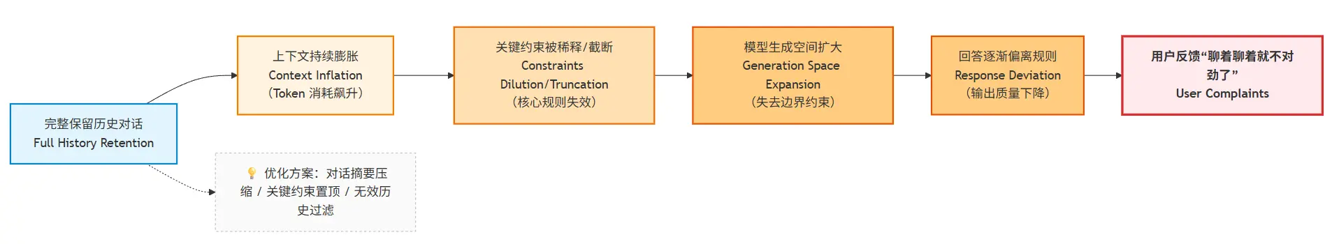 当我们坚持 “全量保留历史对话” 时,对话系统会沿着一条可预见的路径逐渐失控,我们可以用一个流程图来理解这个过程: