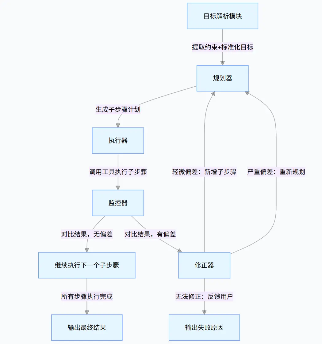 - ④ 监控修正能力:能识别“执行偏差”(如超预算、超时效),并判断是“调整子步骤”(如二次筛选供应商)还是“重新规划”(如预算严重不足,需和用户协商调整目标)。